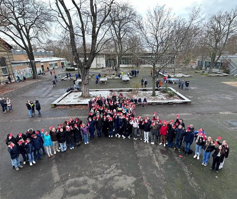 Am 01.12.23 war der Welt-Aids-Tag, der auch in der Großen Schule vom Schülerratsvorstand thematisiert worden ist. Dafür gingen sie durch die Klassen, klärten über die Krankheit auf und teilten Infobroschüren, Kondome und die typischen roten AIDS- Schleifchen gegen eine kleine Spende aus. Das eingenommene Geld wird an die Weltaidshilfe in Braunschweig gespendet, die Patienten aus der Region unterstützt. Zusätzlich setzte der SR-Vorstand zusammen mit dem 9. und 10. Jahrgang ein Zeichen für den positiven Umgang mit der Krankheit. In der großen Pause versammelten sie sich auf dem Schulhof und stellten eine Aids- Schleife. Dabei hielt jede Person eine rote Hand in die Luft.