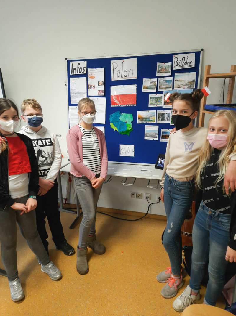 Unter dem Motto „Wir sind bunt“ veranstaltete der 5.Jahrgang der Großen Schule am 29.03. seinen traditionellen internationalen Tag. Hierbei haben die Schülerinnen und Schüler die Möglichkeit, die Länder vorzustellen, aus denen sie selbst, ihre Eltern oder auch Großeltern zu uns nach Deutschland gekommen sind. Dabei entscheiden die Kinder selbst, wie und was sie präsentieren und bringen dabei stets kreative Ideen zum Ausdruck. Die Vorbereitungen begannen bereits im Oktober und mit viel Liebe und Bedacht wurden die Inhalte aufbereitet. Dabei arbeiten in jeder Gruppe mindestens ein „Experte“ der vorzustellenden Nationalität und weitere Mitschüler zusammen. Gemeinsam erstellen Sie dann ein Konzept für die Präsentation und beschäftigen sich dabei intensiv mit dem Land. Auch in diesem Jahr gab es wieder eine abwechslungsreiche Ausstellung. Selbst gedrehte Filme, Gesang und Livemusik, Modelle zum Anfassen und natürlich auch Landkarten und Plakate – ein bunter Mix für eine bunte Schule.
